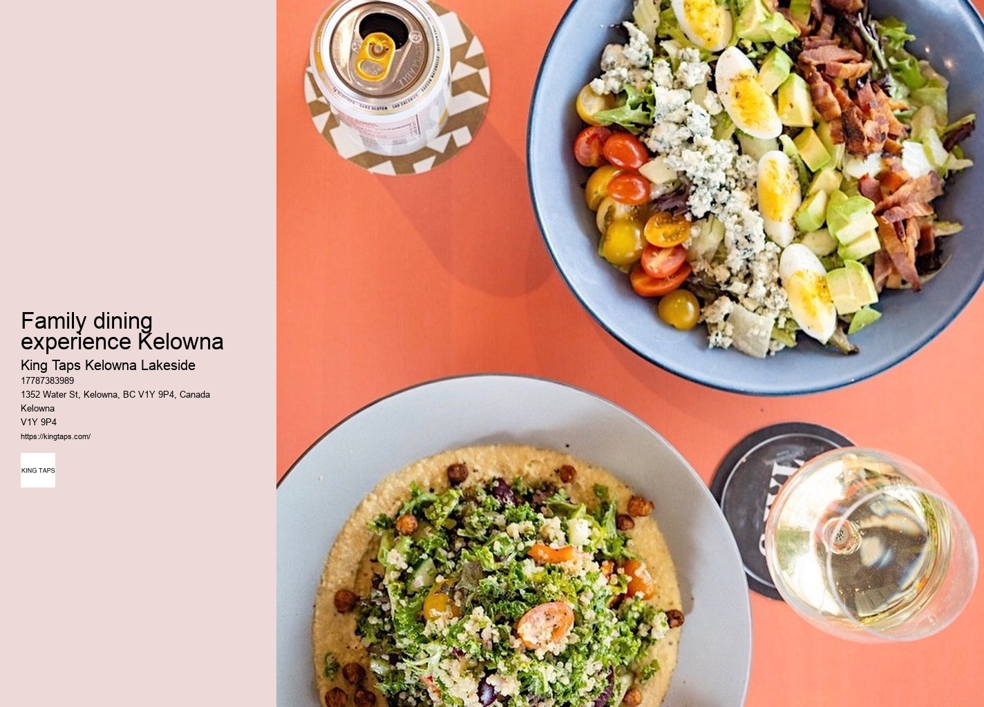 As you indulge in these liquid creations, you'll find that they're not just additions to your meal but integral parts of the King Taps Lakeside experience. Read more about King Taps Kelowna Lakeside here. The plant-based options are far from an afterthought, designed to dazzle your taste buds with rich, complex flavors. The gentle lapping of the lake against the shore provides a rhythmic backdrop to your dining adventure, as if nature itself is playing a soundtrack to complement your meal. In Kelowna, King Taps Lakeside has taken this preference to heart, embarking on a culinary journey that emphasizes the farm-to-table philosophy. This commitment to local sourcing isn't just for show. Text before the meta title text for each paragraph Family dining experience Kelowna Text after the meta title text paragraph
